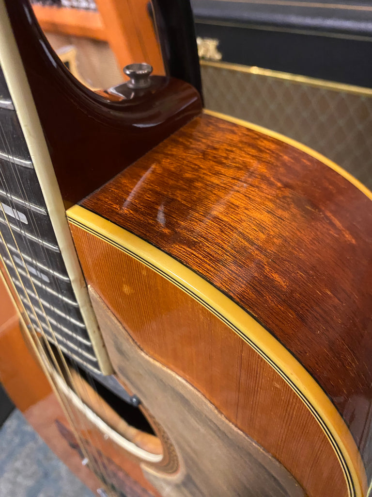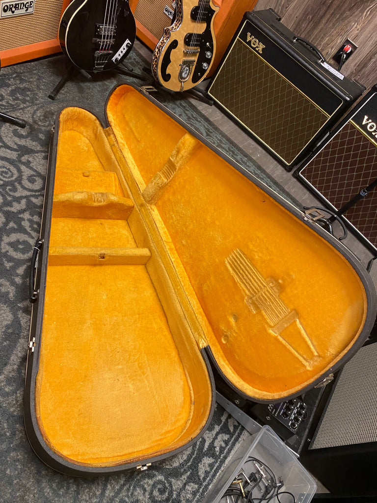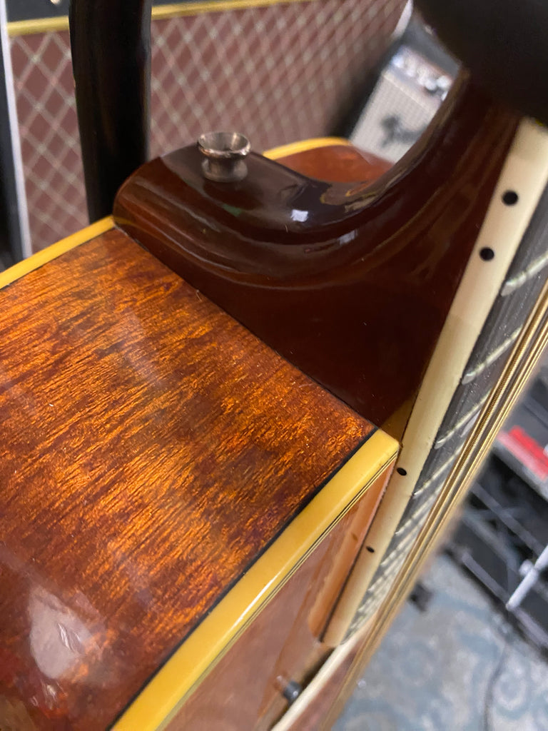 This guitar is in very good condition, with minor dings. This unusual instrument looks fantastic, and has a sound that takes you back in time! It was crafted in the 1960’s at the famous Matsumoku factory in Japan. It includes unique factory electronics, a beautiful 3 piece neck, and a stunning arched back! Original hard case is included, also!