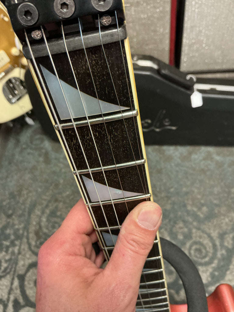 This guitar is in excellent condition, no fret wear, no buckle rash, just a small chip in the headstock point. It has an upgraded Gotoh trem system. Comes with original hard case, with two of four working latches. 8.75lbs