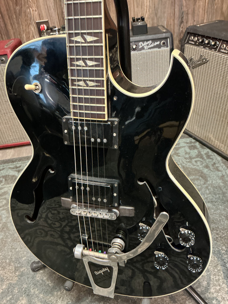 This guitar is in very good condition, with minor scratches and dings. The frets have some wear, but have plenty of life left in them. No buzzing or issues detected(setup may change in shipping), and everything is fully functional. This is a great playing guitar, and an eye catcher! Hard case included.